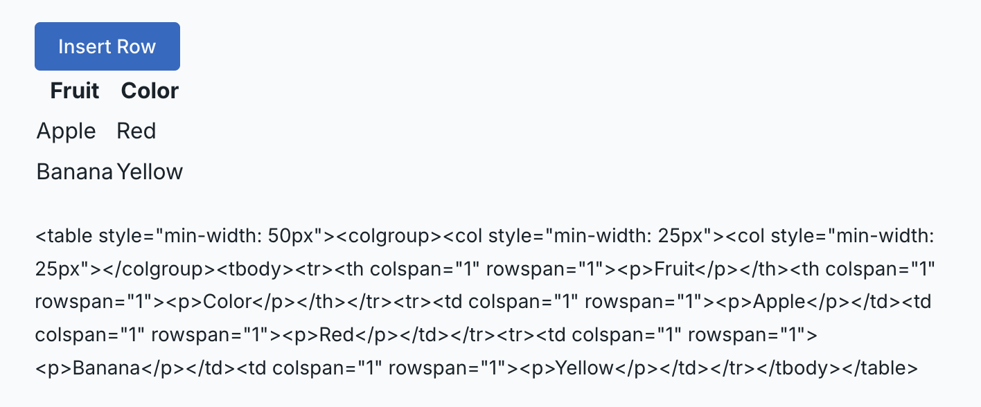<Text> { tableEditor.getHtmlSource() } </Text>